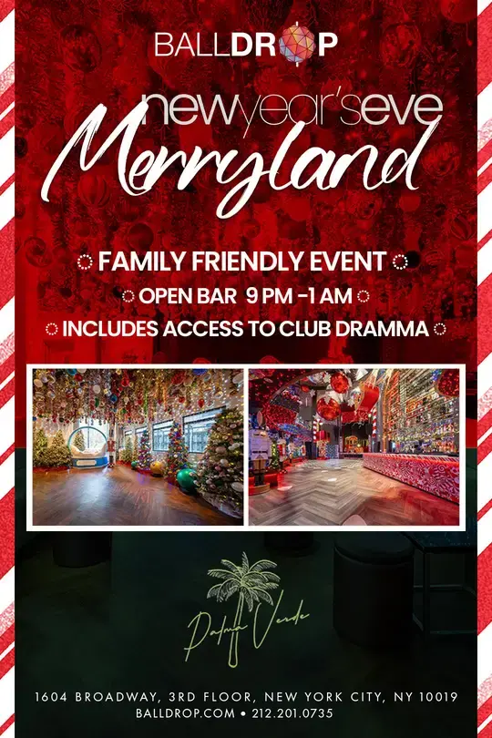 This New Year’s Eve, elevate your celebration—literally—at Palma Verde, the vibrant VIP penthouse level of Dramma Nightclub, transformed into Merryland, Times Square’s most spirited family-friendly holiday party. Designed with over-the-top Christmas décor, bold color, sparkling lights, and immersive festive scenes, this event delivers all the excitement of NYE with a warm, playful, holiday twist.