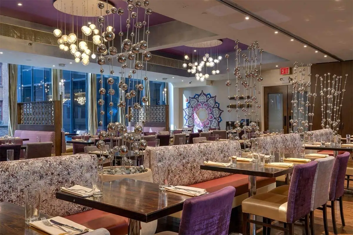 Located in Midtown, New York City, Utsav is a unique and elegant restaurant destination that hangs above 46th Street on an elevated skyway. Its unusual location affords Utsav’s guests a captivating view of the city streets while floor-to-ceiling windows floods the space with natural light during the day and dazzling city lights at night. With a simple, elegant décor and layout, Utsav presents delightful and sophisticated ambiance, and its heavenly vibe is enhanced by billowing drapes on the ceiling and leafy green plants. Insiders of New York’s culinary and nightlife scene flock to Utsav for its upscale dining and unique ambiance and this New Year’s Eve, it is the most divine backdrop for a supercharged NYE party for celebrants of any age.